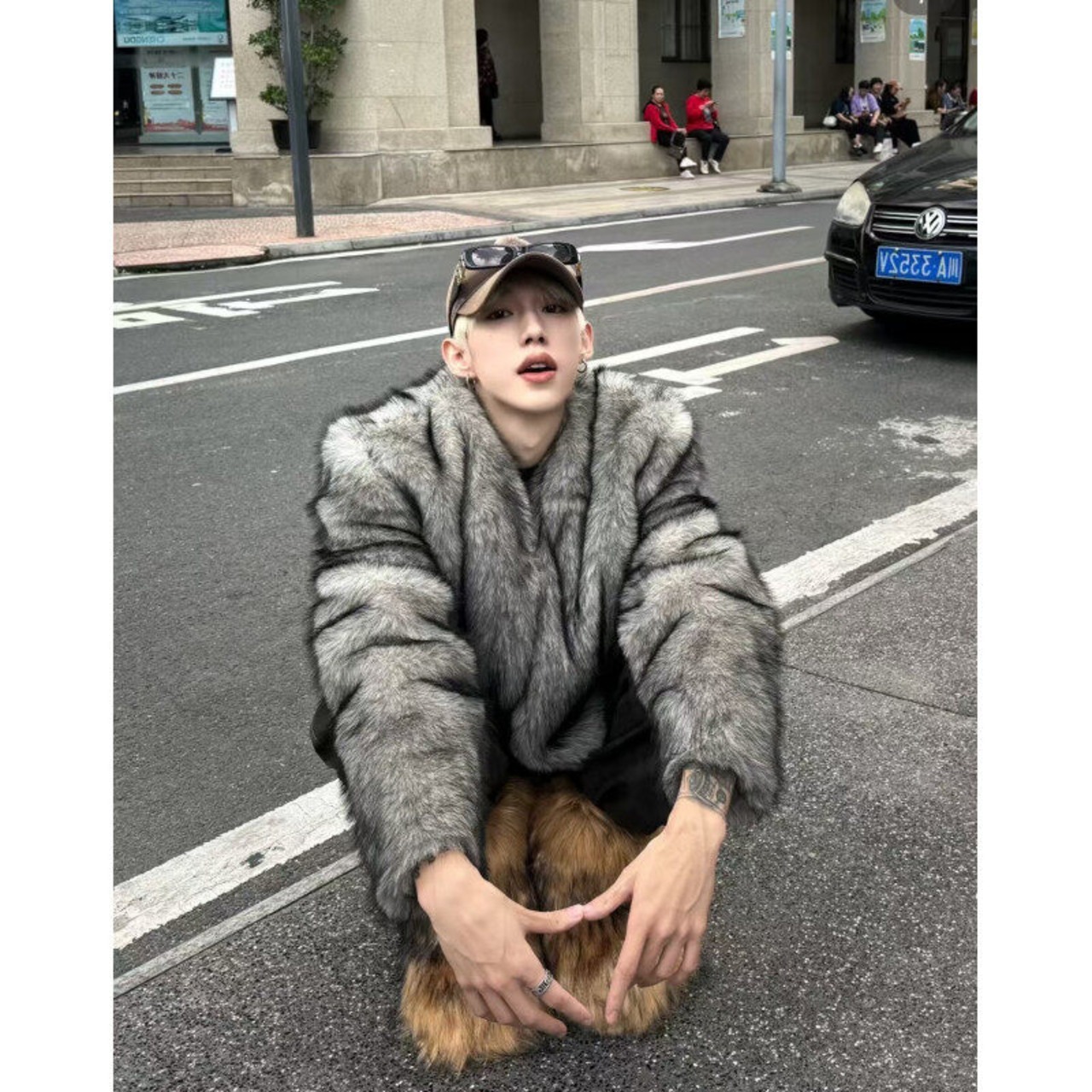 ショートファーコート【韓流メンズスタイル】ブラックグレー