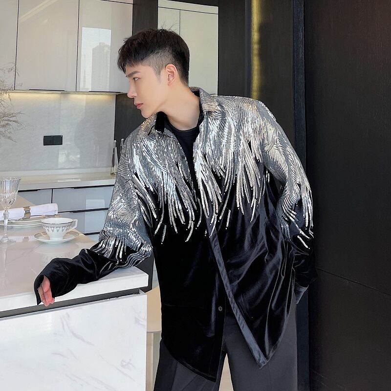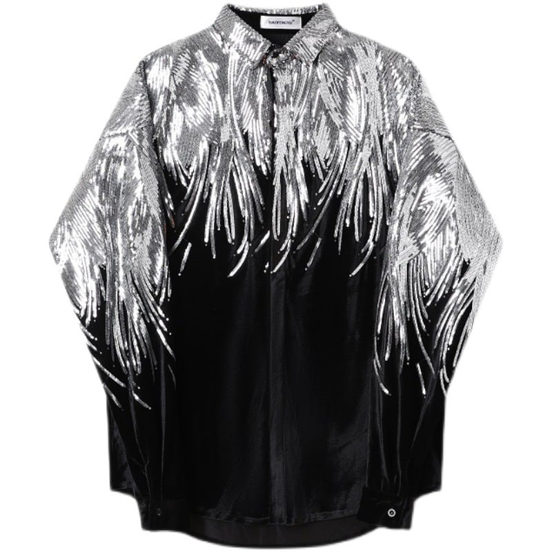コレクションシャツ【韓流メンズスタイル】ジュディ・ブレイム キム・ジョーンズ 大きいサイズ ストリート シルバー 長袖 メンズ レディース 演出 舞台 歌手 キラキラ イベント