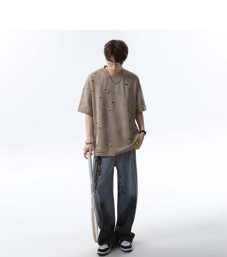 大胆なダメージ加工が特徴のオーバーサイズTシャツ