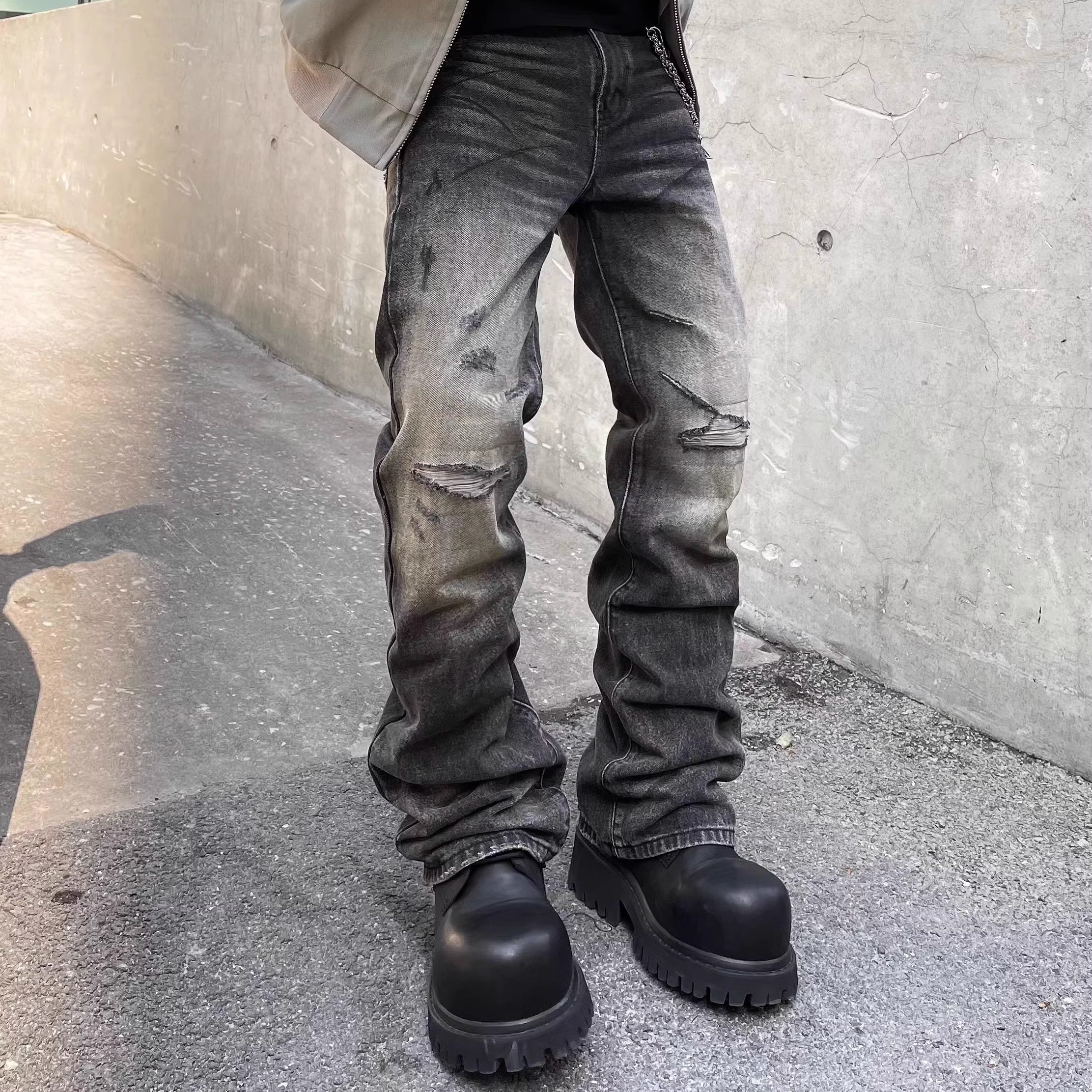 ダメージドストレートデニム【超韓流メンズスタイル】スリムフィットロングパンツ