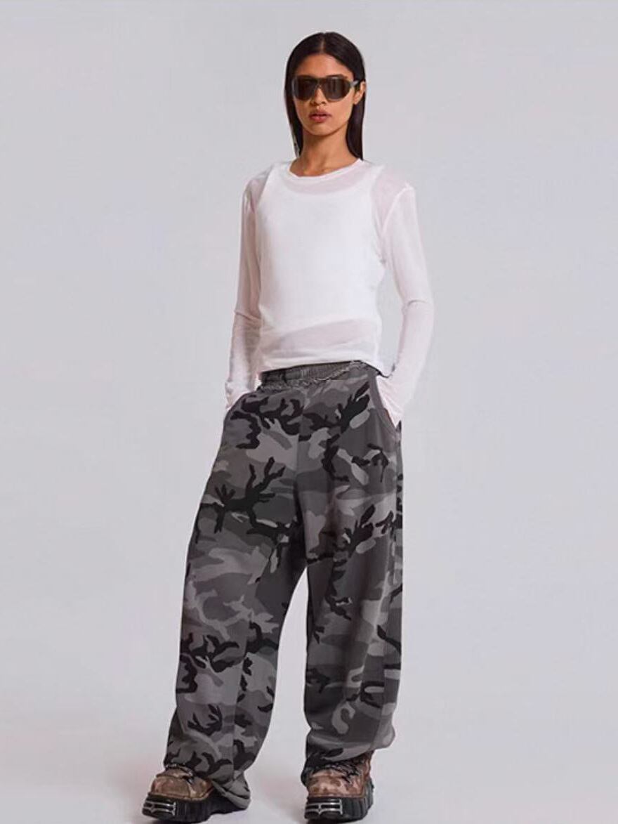 グレーミリタリー迷彩 ワイドレッグストレートパンツ ハイウエストスウェットパンツ ランニングスポーツ ヒップホップスタイル【超韓流メンズスタイル】